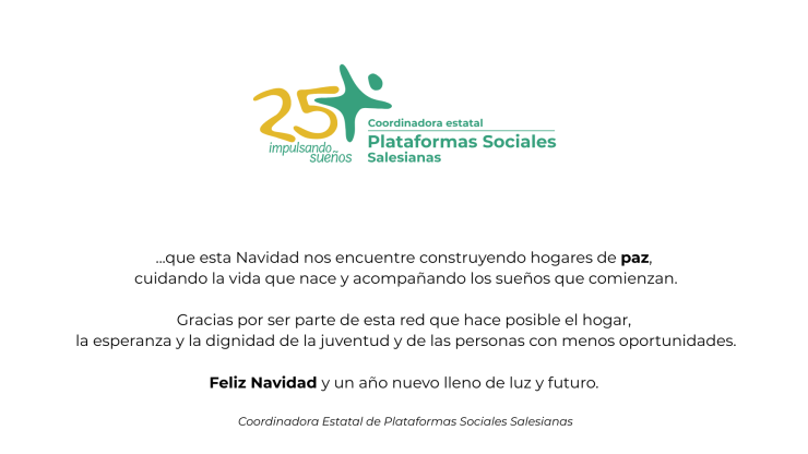 La Coordinadora Estatal de Plataformas Sociales Salesianas (CEPSS) ha compartido su felicitación de Navidad 2025 con un mensaje cargado de simbolismo, compromiso social y agradecimiento. Bajo el versículo bíblico ‘Mi pueblo habitará en moradas de paz, en hogares seguros y en lugares de reposo’ (Isaías 32,18), la propuesta pone el foco en uno de los grandes retos sociales actuales: el acceso a la vivienda, especialmente entre la juventud.