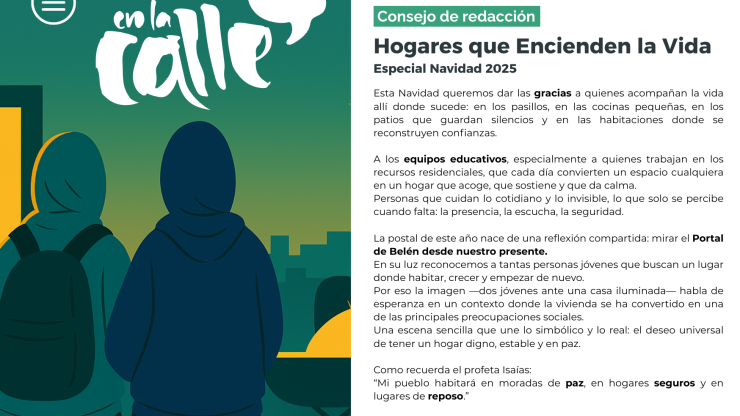 La imagen central de la felicitación reinterpreta el Portal de Belén en clave contemporánea. Dos jóvenes ante una casa iluminada, acompañados de un carrito de bebé, evocan la vida que comienza y la esperanza que se abre paso incluso en contextos de dificultad. Una escena sencilla que conecta lo simbólico con la realidad cotidiana de muchas personas jóvenes que buscan un lugar donde habitar, crecer y construir su proyecto de vida.