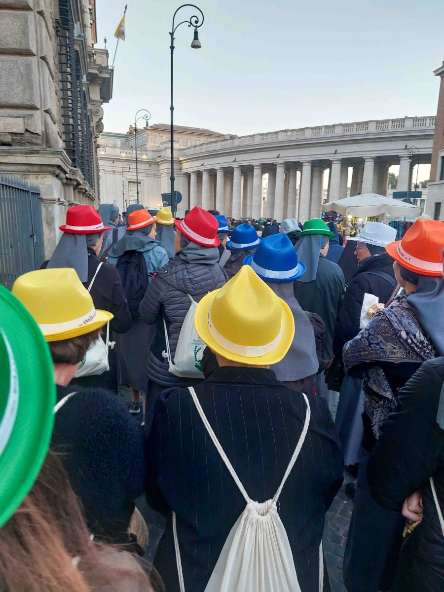 ¡Llegó el gran día! El domingo la plaza de San Pedro empezó a llenarse desde muy temprano, todavía a la luz de la aurora, los sombreros de colores que nos distinguían por ser de sor María Troncatti, comenzaban a coger los primeros lugares de la gran plaza.
